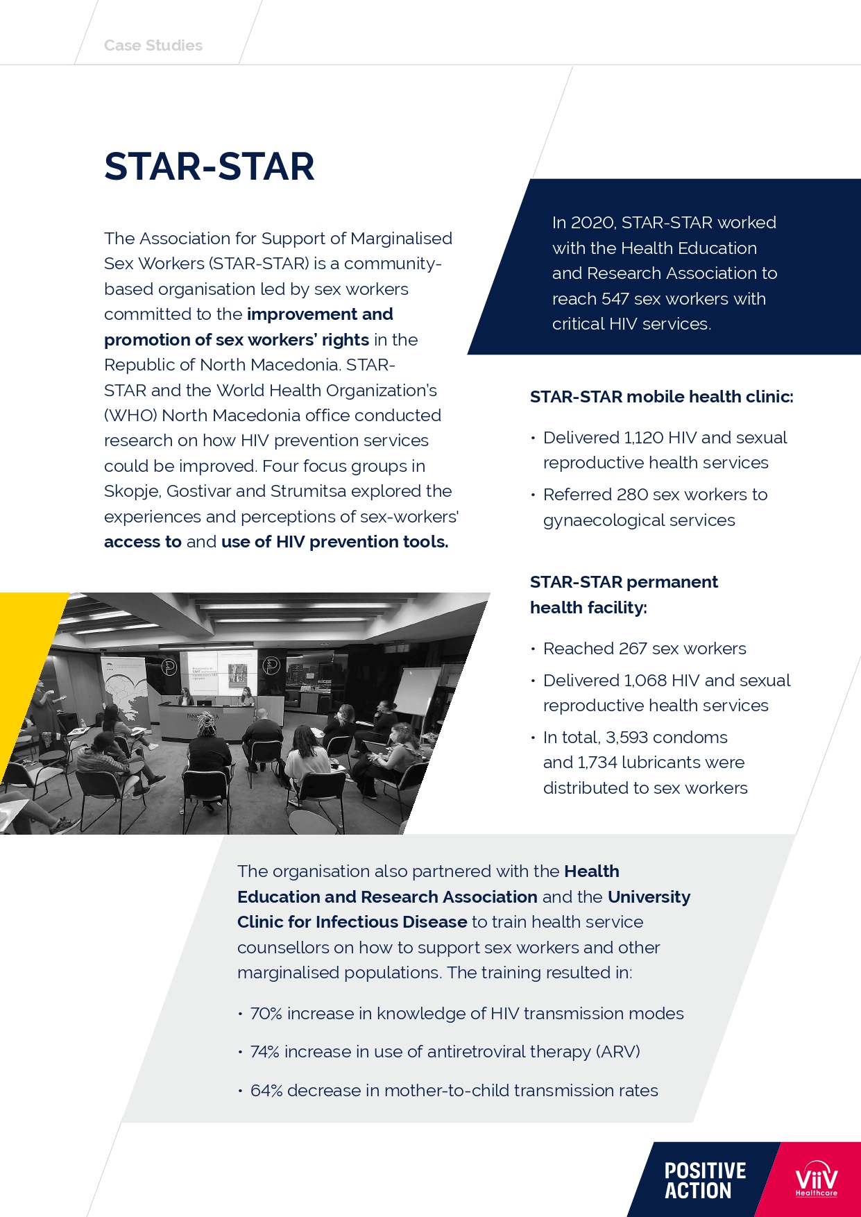 Во рамки на извештајот објавен од ViiV Healthcare, презентирани се студии на случаеви кои ја претставуваат работата на организациите, финансиски поддржани преку програмата на Positive Action, кои работат со заедници засегнати од ХИВ и СИДА, меѓу кои и резултатите кои ги постигна СТАР-СТАР за зајакнување на програмите наменети за заедницата на сексуални работници засеганти од ХИВ во Република Северна Македонија, и во намалување на стигмата и дискриминацијата во пристапот до здравствени услуги за превенција и третман од ХИВ.