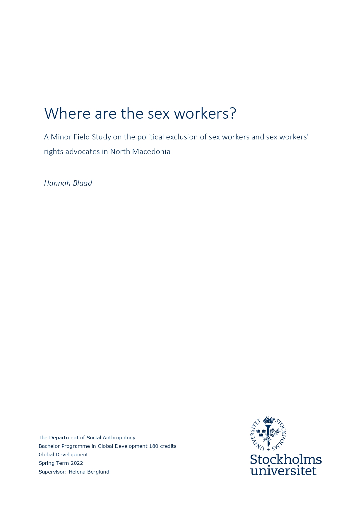 Истражувањето за теренската студија „Каде се сексуалните работници?“ на Хана Блад, беше спроведено за време на нејзиниот двомесечен престој во Скопје, работејќи на нејзината дипломска теза и ја опишува моменталната состојба на сексуалната работа и сексуалните работници во Северна Македонија.
