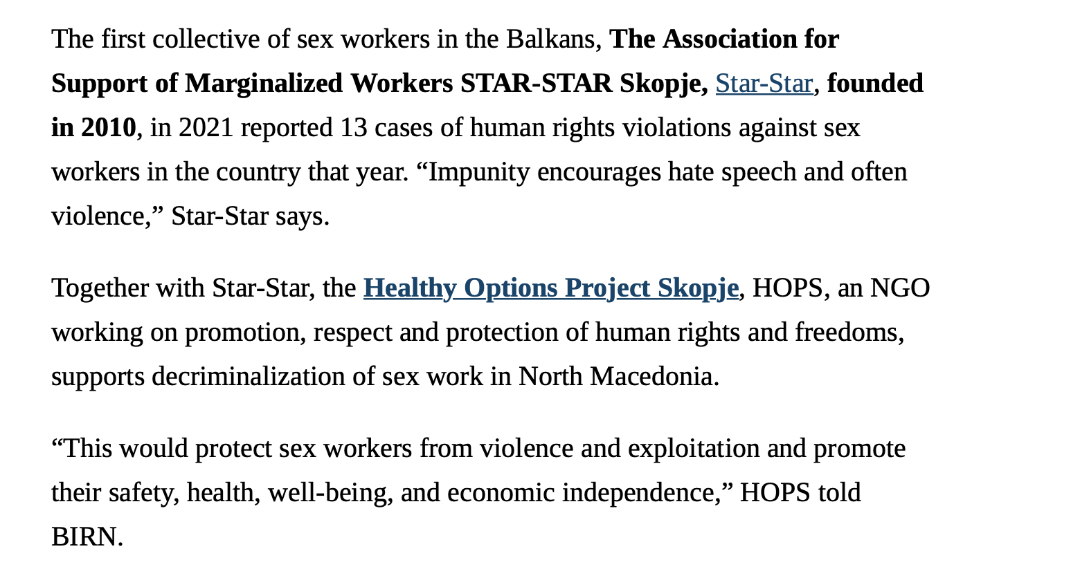 „Сексуалната работа во повеќето балкански земји останува нелегална и подложна на кривично гонење – лишувајќи ги сексуалните работници од пристапот до здравствена и социјална заштита и оставајќи ги ранливи на експлоатација.“