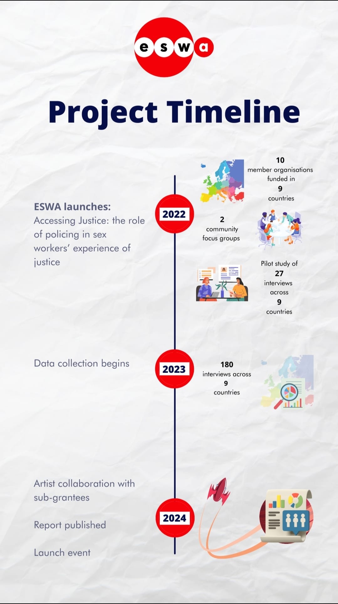 За многу сексуални работници и други маргинализирани заедници, полицијата може да биде пречка за пристап до правдата, кога тие не се директни извршители на насилство врз сексуалните работници, затоа главниот фокус на ова истражување е токму полициското работење и улогата на полицијата во пристапот на сексуалните работници до правдата. Со ова истражување, ESWA има за цел да ги собере и да ги прикаже сите докази за отежнет пристап на сексуалните работници до правдата.
