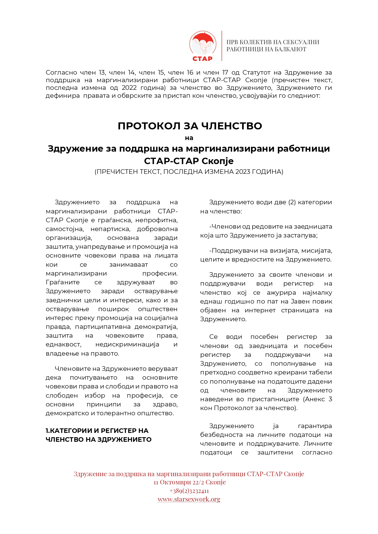 Врз основа на Oдлука на Собранието на Здружението бр. 02-131/1 од 25.03.2023, донесена и усвоена на Годишно собрание на Здружението за деловната 2022 година, престанува важноста на Протоколот за членство на Здружение за поддршка на маргинализирани работници СТАР-СТАР Скопје, заведен под број 02-470/2 од ден 09.11.2020 година, и отпочнува важноста на Протокол за членство на Здружение за поддршка на маргинализирани заедници СТАР-СТАР Скопје (пречистен текст, последна измена 2023 година), со број 02-131/2 од 25.03.2023 година.