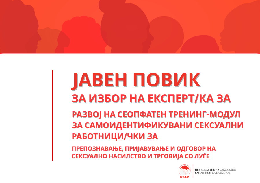 Здружението за поддршка на маргинализирани работници СТАР-СТАР Скопје, на ден 21.11.2025 година, објавува Јавен повик за избор на експерт/ка за развој на сеопфатен тренинг-модул за самоидентификувани сексуални работници/чки за препознавање, пријавување и одговор на сексуално насилство и трговија со луѓе со цел да се обезбеди функционален, контекстуално релевантен и практично употреблив едукативен ресурс за самоидентификувани сексуални работници, кој ќе овозможи унапредување на нивната безбедност, информираност, пристап до поддршка и капацитети за самозаштита.
