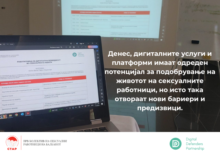 На 05.07.2024, во Струмица, ја одржавме првата од серијата работилници за дигитална безбедност во сексуалната работа. Оваа работилница има за цел да ги зајакне капацитетите на сексуалните работници за справување со дигиталните закани врз човековите права.
