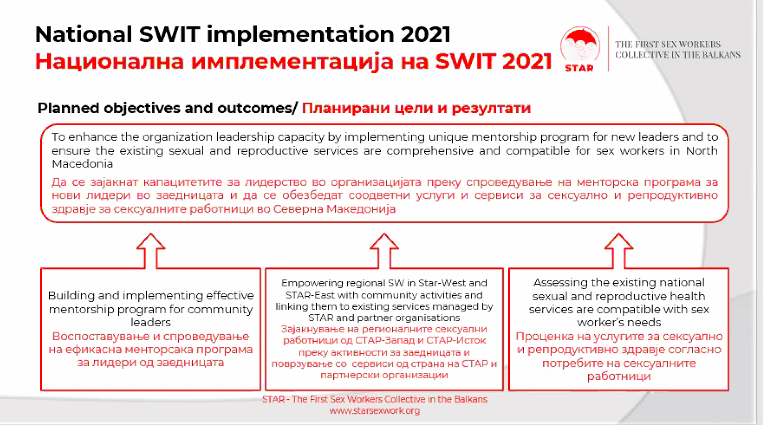 На онлајн состанок организиран од SWAN, учествуваа 21 претставник од организации од седум земји, во кои е промовирана SWIT алатката. Преку свои презентации сите претставници споделуваа искуства од работата на SWIT програмата во своите земји, за придобивките и пречките со кои се соочувале за време на имплементацијата, меѓу кои и претставник на СТАР- Прв колектив на сексуални работници на Балканот, Ненад Мицов, кој презентираше за придобивките од реализираните активности за сексуалните работници во Македонија, во рамки на националната имплементација на SWIT програмата.