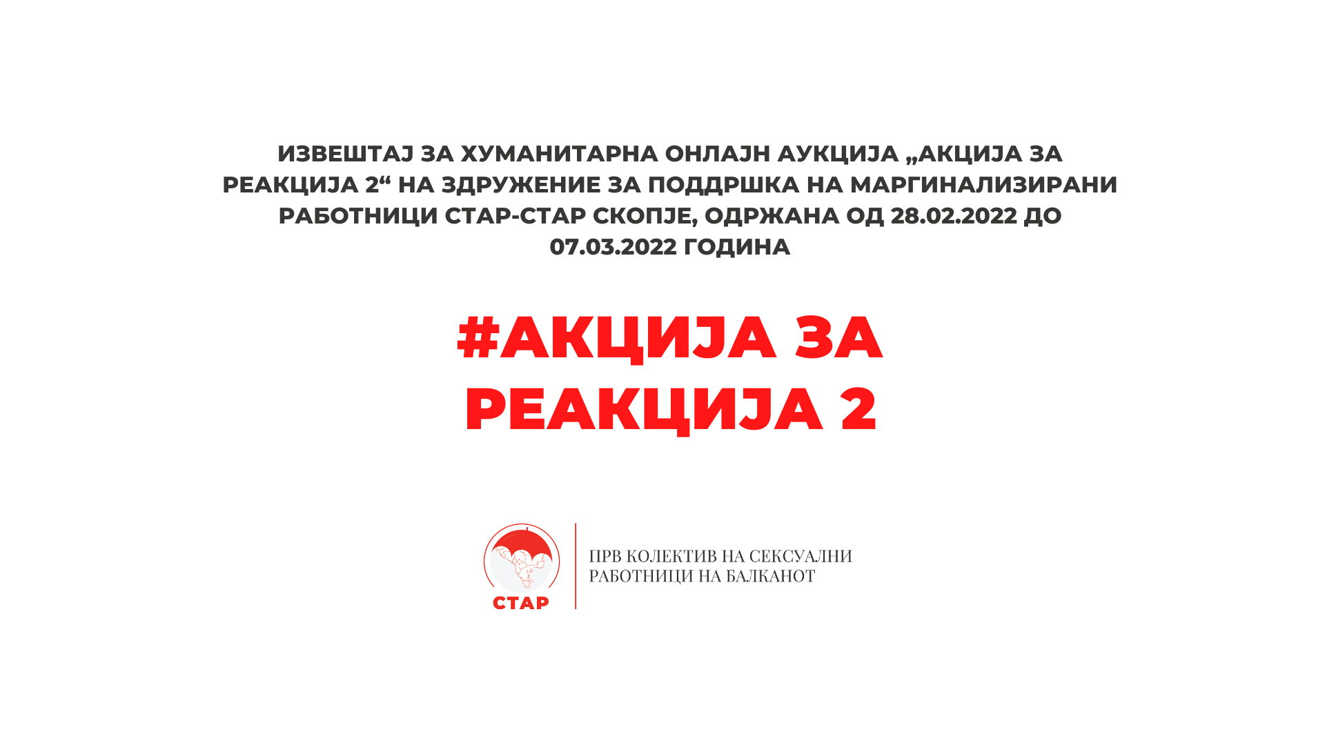 Извештај за хуманитарна онлајн аукција „Акција за реакција 2“ на Здружение за поддршка на маргинализирани работници СТАР-СТАР Скопје, одржана од 28.02.2022 до 07.03.2022 година