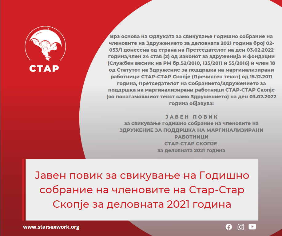 ЈАВЕН ПОВИК за свикување Годишно собрание на членовите на ЗДРУЖЕНИЕ ЗА ПОДДРШКА НА МАРГИНАЛИЗИРАНИ РАБОТНИЦИ СТАР-СТАР СКОПЈЕ за деловната 2021 година